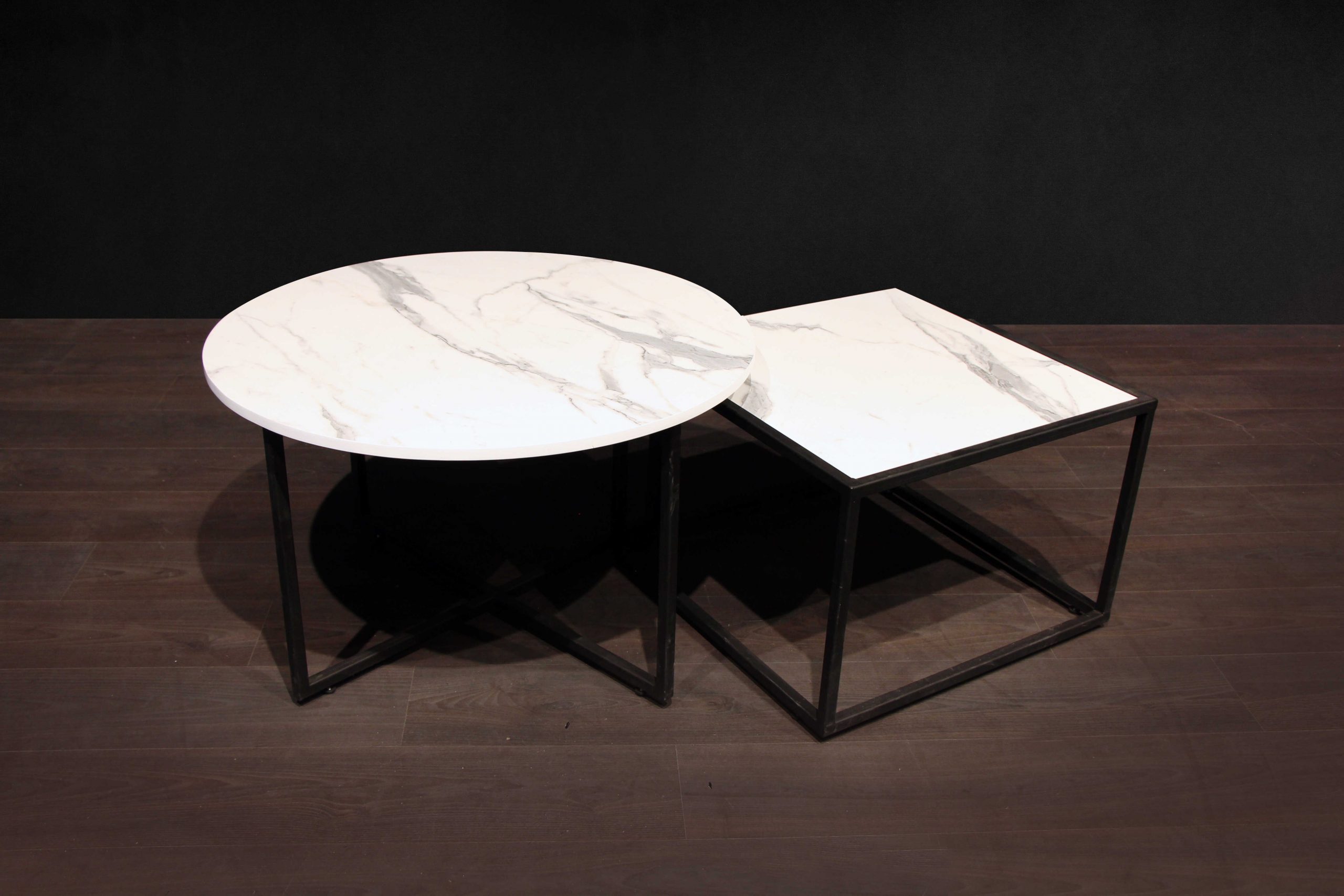 זוג שולחנות סלון יוקרתיים, בשילוב שיש לבן וברזל שחור. ניתן לשנות מידה וצבע.