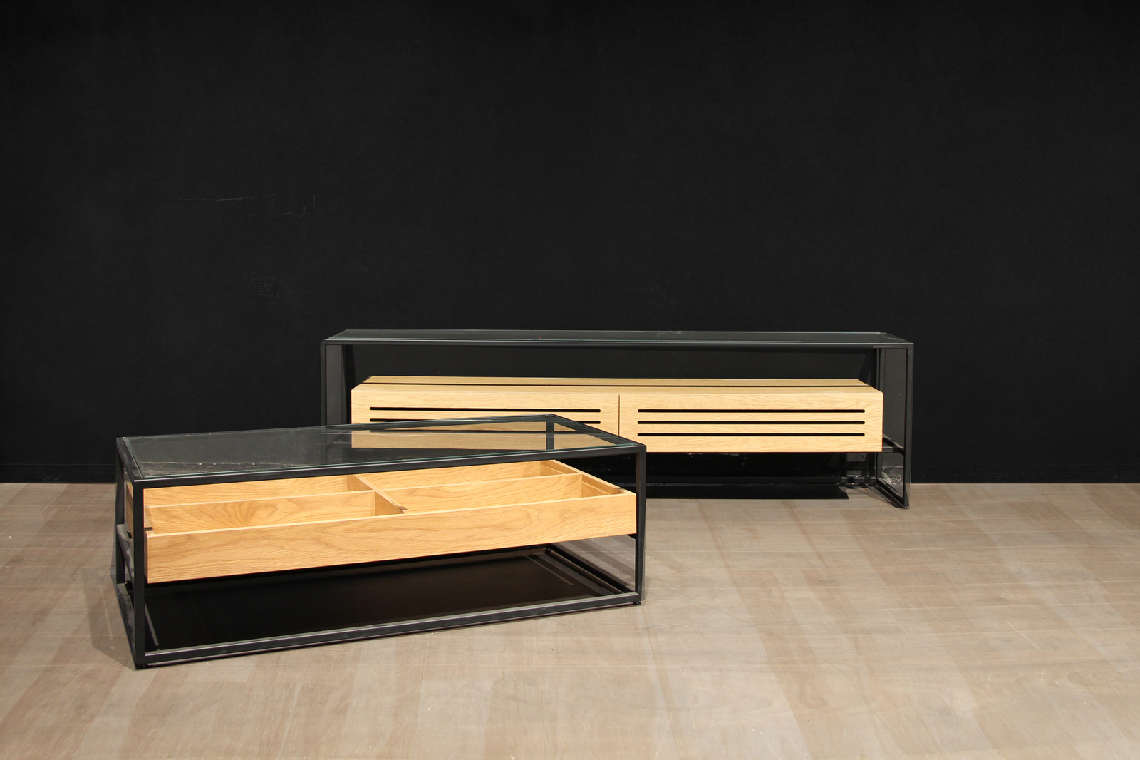 מזנון ושולחן, עץ טבעי וברזל שחור כמעטפת. ניתן לשנות גדלים למגירות. שולחן זכוכית באורך 120/60 אפשרות לשינוי נראות.